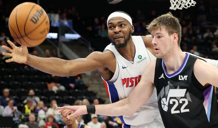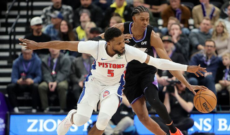 Detroit Pistons guard Malik Beasley (5) tries to get the ball away from Utah Jazz forward Cody Williams (5) during an NBA game at the Delta Center in Salt Lake City on Monday, March 3, 2025. | Kristin Murphy, Deseret News