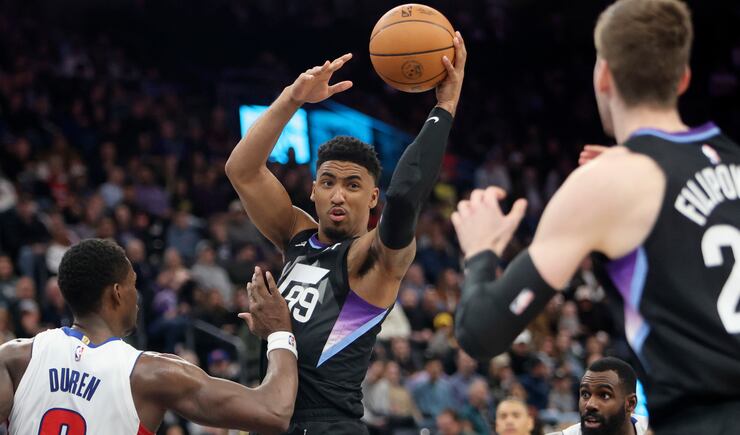 Utah Jazz forward KJ Martin (99) looks to pass the ball to Utah Jazz forward Kyle Filipowski (22) as Detroit Pistons center Jalen Duren (0) guards him during an NBA game at the Delta Center in Salt Lake City on Monday, March 3, 2025. | Kristin Murphy, Deseret News