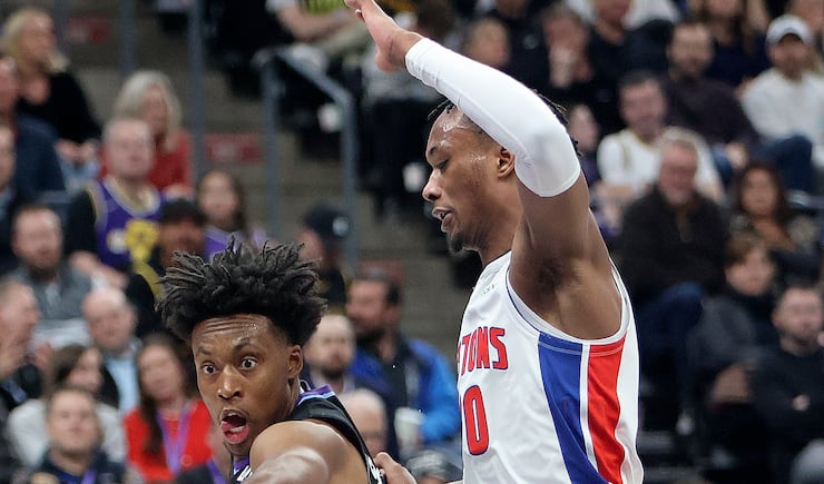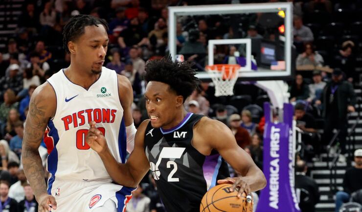 Utah Jazz guard Collin Sexton (2) moves around Detroit Pistons forward Ronald Holland II (00) during an NBA game at the Delta Center in Salt Lake City on Monday, March 3, 2025. | Kristin Murphy, Deseret News