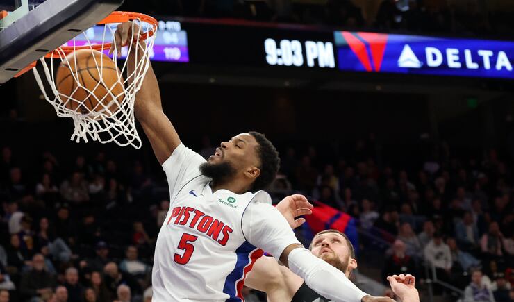 Detroit Pistons guard Malik Beasley (5) dunks the ball in front of Utah Jazz guard Svi Mykhailiuk (19) during an NBA game at the Delta Center in Salt Lake City on Monday, March 3, 2025. Jazz lost 134-106. | Kristin Murphy, Deseret News