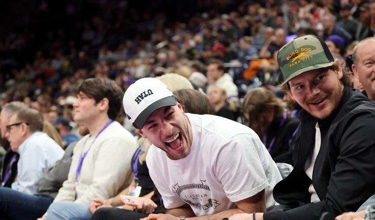 Utah Hockey Club defenseman Sean Durzi laughs with his teammates as they watch the Utah Jazz play the Detroit Pistons in an NBA game at the Delta Center in Salt Lake City on Monday, March 3, 2025. Jazz lost 134-106. | Kristin Murphy, Deseret News