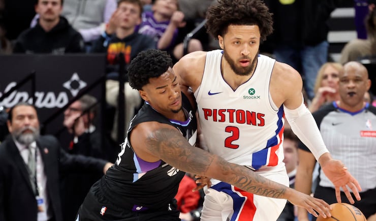 Utah Jazz forward Brice Sensabaugh (28) tries to get the ball away from Detroit Pistons guard Cade Cunningham (2) during an NBA game at the Delta Center in Salt Lake City on Monday, March 3, 2025. Jazz lost 134-106. | Kristin Murphy, Deseret News