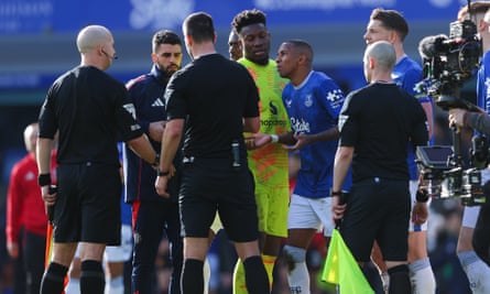 Goodison was suddenly, unnecessarily, consumed by nerves every time United took possession. The fear of throwing away a comfortable lead was justified, however, eight minutes later when the visitors scored from another set piece. A Fernandes free-kick was again the source, this time floated in from deep for Beto to head clear but only as far as Ugarte. The midfielder had time on the edge of the penalty area to control with his chest and steer his first United goal beyond Pickford from 18 yards. Pickford saved superbly to deny Fernandes in the final minute before United were saved themselves by VAR and Madley.